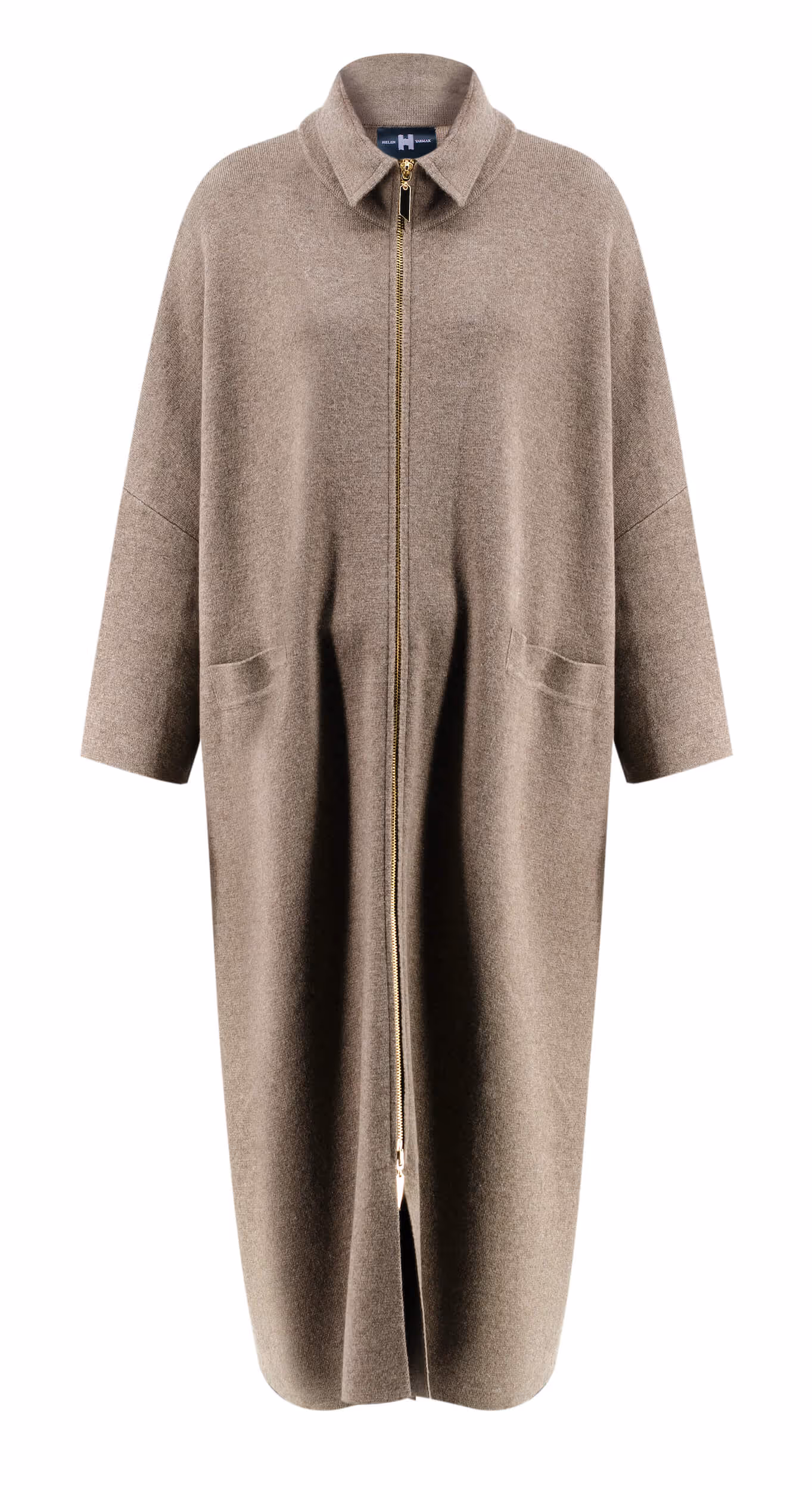 Unlined single-breasted knitted cashmere coat. Zipper closure. 2 patch hand pockets. Drop shoulder.