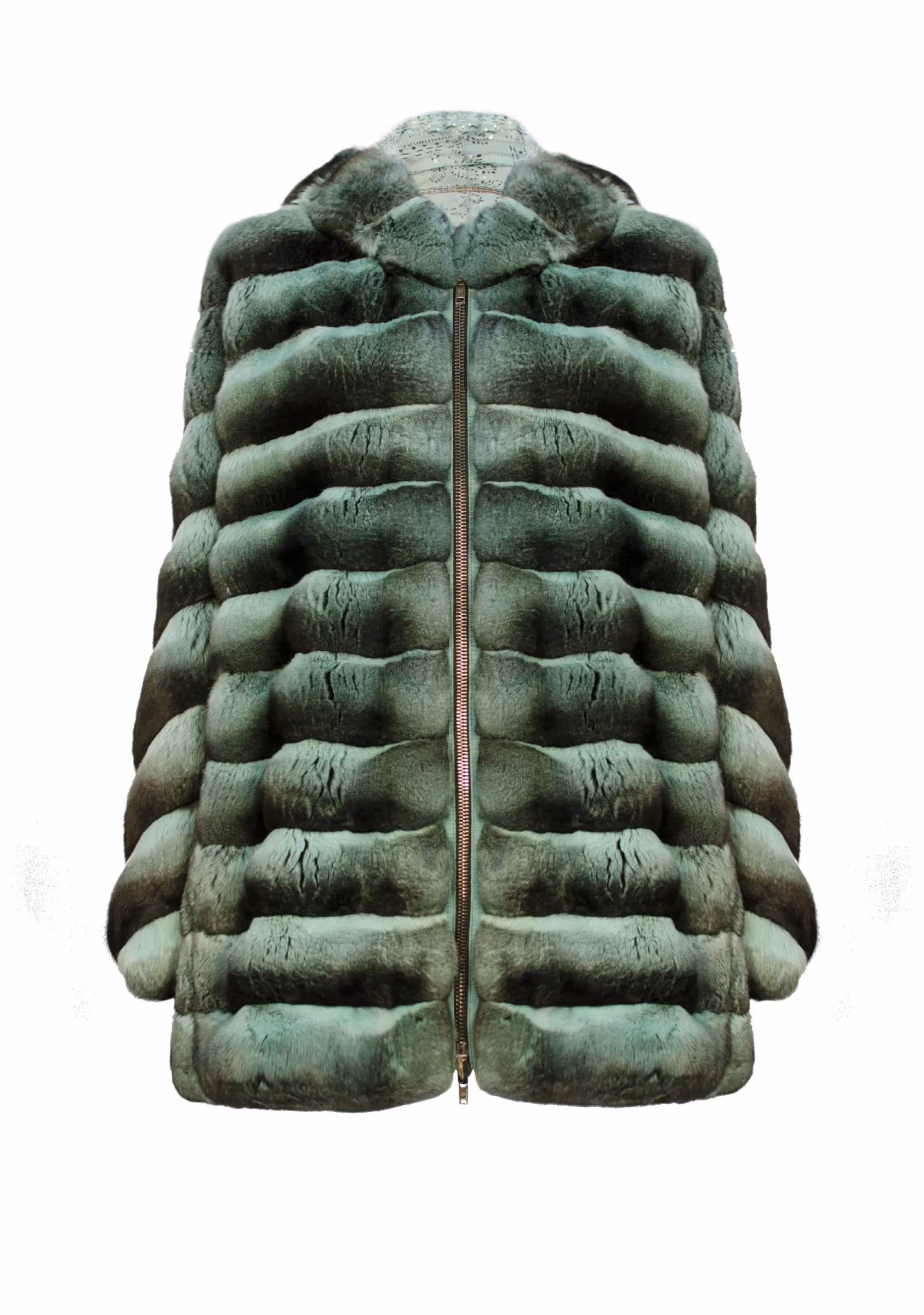 Reversible chinchilla jacket with a hood. Body front: half-skin horizontal type of workmanship. Sleeves: half-skin chevron type of workmanship. Regular fit. Side slit pockets. Zip closure. Detachable 100% silk lining with signature Helen Yarmak print. Fur origin: Denmark. Scientific name: chinchilla lanigera.