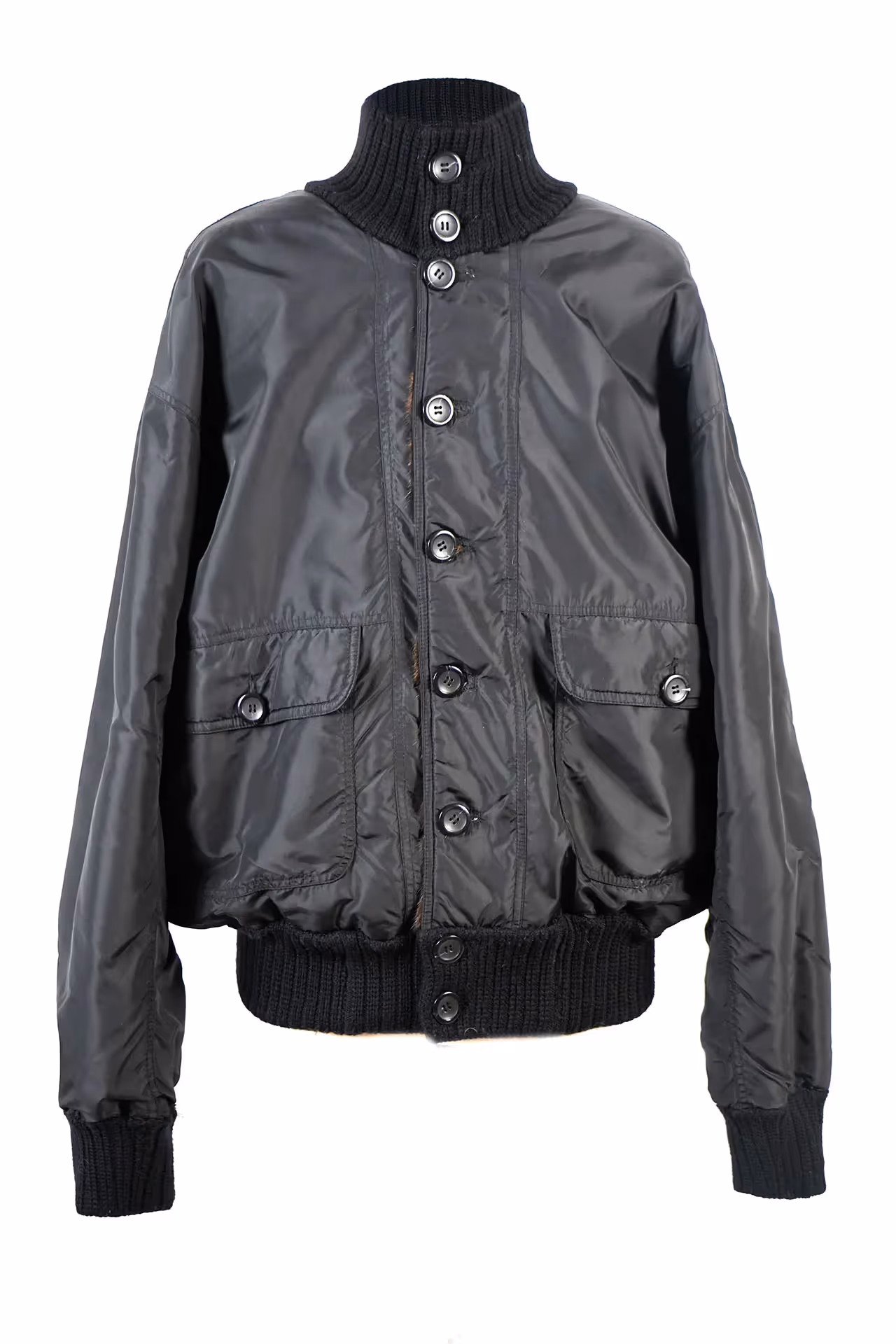 Technical fabric men's bomber jacket with a squirrel fur as an interior side. Stand-up knitted collar, knitted cuffs and bottom.